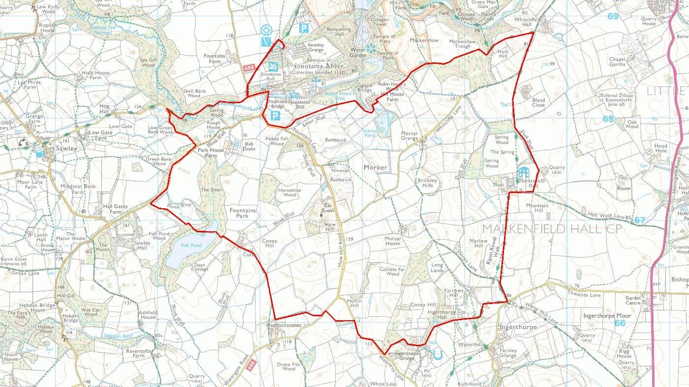 2. Follow the boundary of the monastic precinct wall, through fields and farm buildings. You’ll also pass one of the old monastic fish ponds and look out towards the site of MorkerGrange, one of the abbey’s ‘home granges’. Continue to follow the bridleway, along the edge of woodland and passing the Mackershaw Lodges. At the path junction continue straight ahead and follow the path as it bends and rises to a gate and into fields. Walk across the fields until you reach a lane