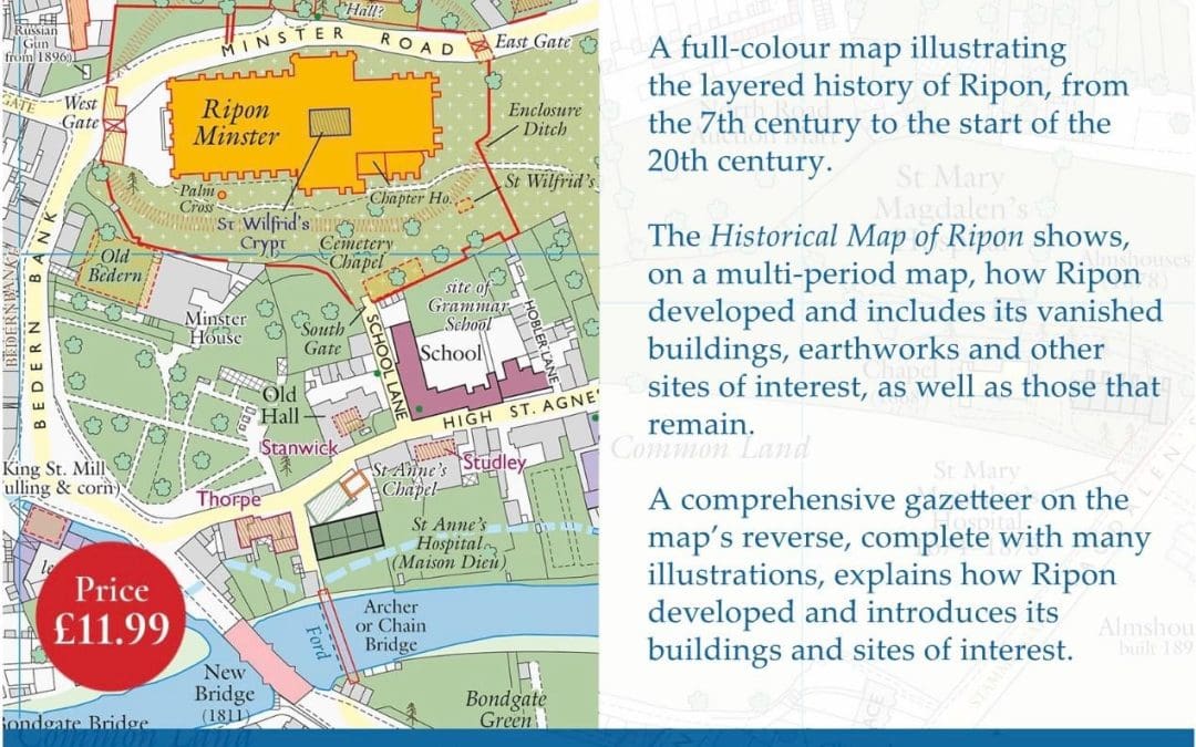 The multi-period map showcases both the vanished and surviving landmarks of Ripon, bringing its vibrant past to life. The reverse side features a comprehensive gazetteer, enriched with numerous illustrations, detailing Ripon’s development and highlighting its buildings and sites of interest.