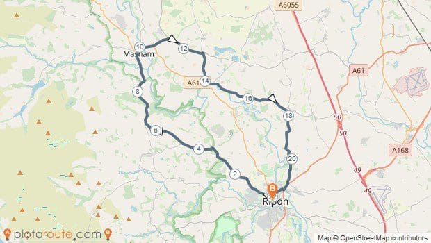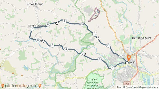 A moderate circular route that starts in Ripon Market Square before heading out on Studley Road to Galphay, from where the route then loops through Kirkby Malzeard via Laverton.