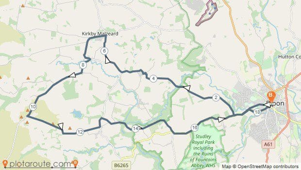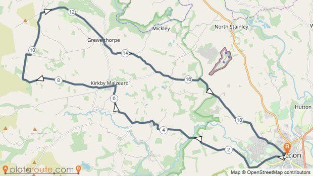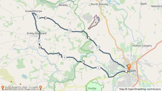A moderate circular route that passes through Galphay & Kirkby Malzeard before reaching the half way point at Grewelthorpe and looping back down Kirkby Road into Ripon.