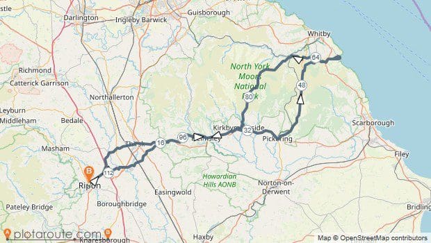 A very challenging route for experienced road cyclists to Robin Hoods Bay, involving over 9000ft of climbing.